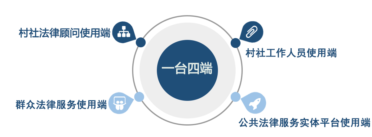 运用互联网、大数据等信息技术手段,通过村社法律顾问助手“一台四端”整合辖区所有村社法律顾问,综合解决“一村(社区)一法律顾问”工作开展过程中司法行政监管、村社法律顾问服务工效、村社基层依法行政、群众高效享受法律服务、公共服务中心法律服务供给的各方需求,为“一村(社区)一法律顾问”工作的推广覆盖、监督管理和服务效能提供有效的信息化解决方案。