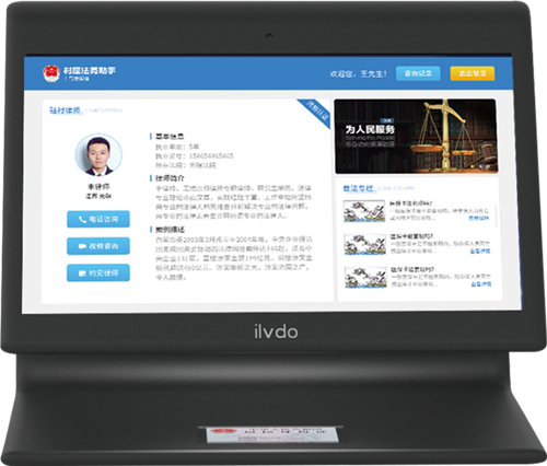 用户只需刷身份证登录系统,就能从全国签约律师中匹配出合适的律师,为用户提供一对一远程视频对话、语音咨询服务等,这就是“互联网·无人律所”。“互联网·无人律所”内置高清触摸终端机、身份证读卡器等,具有快速咨询、文书服务、约见律师、视频咨询等功能。运用律兜法律服务体系,整合众多律师资源,搭建起一个互联网法律服务平台。“村民法务助手”外形酷似台式电脑,是一款适合在连队(社区)公共法律服务站使用的硬件产品,通过调动村(居)法律顾问和律兜法律服务体系内的全国律师资源,为群众及时解决法律问题,辅助基层工作人员开展日常工作和台账管理登记等工作。